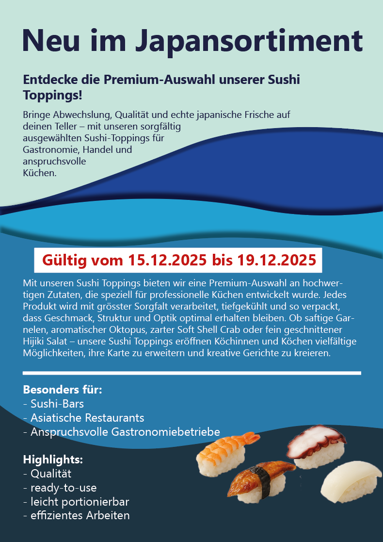 Bringe Abwechslung, Qualität und echte japanische Frische auf deinen Teller – mit unseren sorgfältig ausgewählten Sushi-Toppings für Gastronomie, Handel und anspruchsvolle Küchen.